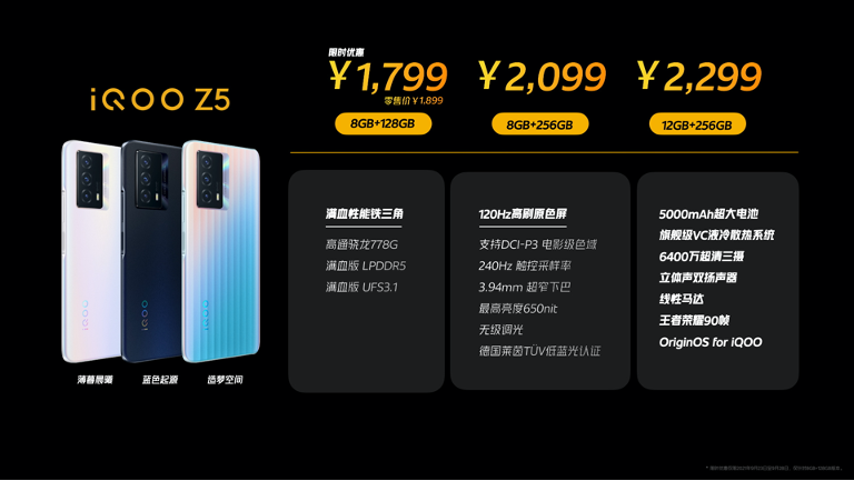 iQOO Z5提供3个版本,8GB+128GB版本售价1899元,8GB+256GB版本售价2099元,12GB+256GB版本售价2299元。9月23日起将在iQOO京东官方自营旗舰店和官方旗舰店、“手机天猫非常大牌日”、iQOO苏宁自营旗舰店、苏宁易购天猫旗舰店iQOO专区、拼多多、抖音、快手等各大平台开启预售,预售期间更有惊喜福利:自预售日至首销日,8GB+128GB版本仅需1799元。9月28日10:00在vivo官网、京东、天猫、苏宁易购vivo手机官方旗舰店正式发售,iQOO线下各大授权门店、vivo体验店同步开售。